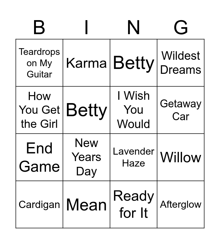 This bingo card has 20 words: Willow, Style, Betty, Invisible String, Cardigan, How You Get the Girl, Mean, Teardrops on My Guitar, End Game, Karma, New Years Day, Lavender Haze, Betty, Afterglow, I Wish You Would, Out of the Woods, Getaway Car, Wildest Dreams, Ready for It and The Archer.
