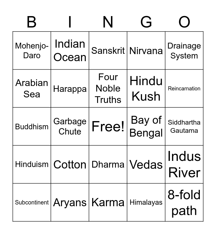 This bingo card has a free space and 28 words: Indus River, Ganges River, Hindu Kush, Himalayas, Arabian Sea, Sanskrit, Indian Ocean, Hinduism, Bay of Bengal, Subcontinent, Buddhism, Nirvana, Aryans, Karma, Reincarnation, Untouchables, Cotton, Harappa, Four Noble Truths, Dharma, Mohenjo-Daro, Monsoon, 8-fold path, Garbage Chute, Siddhartha Gautama, Vedas, Drainage System and Stone seal.
