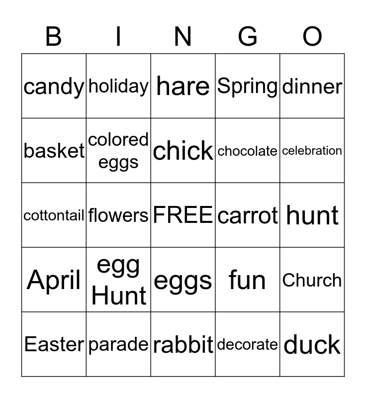 This bingo card has a free space and 24 words: egg Hunt, parade, chick, Easter, dinner, candy, basket, holiday, carrot, eggs, chocolate, cottontail, fun, Church, colored eggs, decorate, hunt, hare, celebration, flowers, duck, April, Spring and rabbit.
