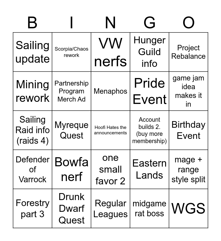 This bingo card has a free space and 24 words: Bowfa nerf, Drunk Dwarf Quest, Menaphos, Forestry part 3, Project Rebalance, Sailing update, Mining rework, Scorpia/Chaos rework, Account builds 2. (buy more membership), one small favor 2, Pride Event, Sailing Raid info (raids 4), Eastern Lands, mage + range style split, Partnership Program Merch Ad, midgame rat boss, Birthday Event, VW nerfs, game jam idea makes it in, Myreque Quest, WGS, Defender of Varrock, Hunger Guild info and Regular Leagues.