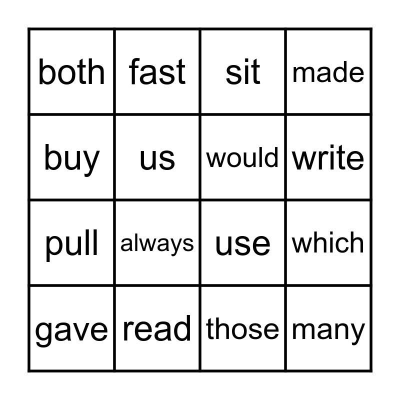 This bingo card has 16 words: read, which, sit, both, pull, fast, use, those, buy, us, gave, made, always, write, would and many.