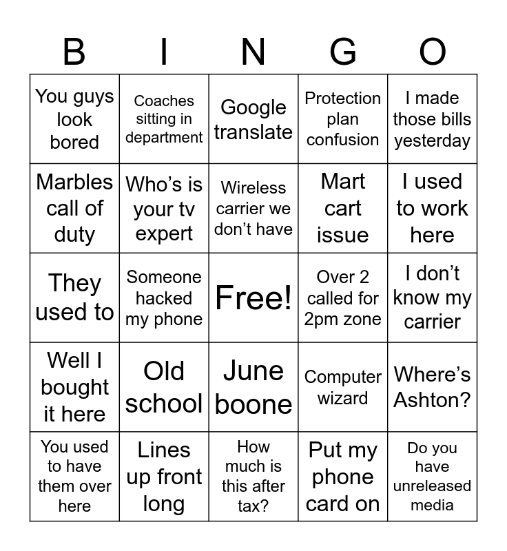 This bingo card has a free space and 24 words: Old school, Lines up front long, Wireless carrier we don’t have, You used to have them over here, I made those bills yesterday, You guys look bored, Marbles call of duty, Coaches sitting in department, Over 2 called for 2pm zone, June boone, Mart cart issue, They used to, Computer wizard, Where’s Ashton?, Who’s is your tv expert, Put my phone card on, I don’t know my carrier, Google translate, I used to work here, Someone hacked my phone, Do you have unreleased media, Well I bought it here, Protection plan confusion and How much is this after tax?.