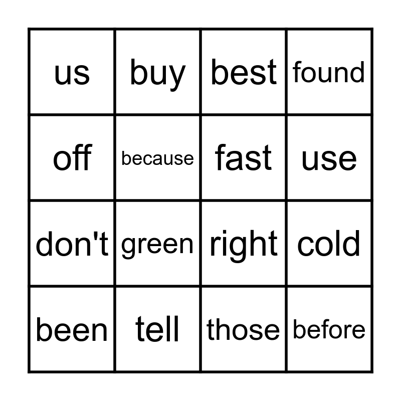 This bingo card has 16 words: tell, cold, best, us, don't, buy, right, those, off, because, been, found, green, use, fast and before.
