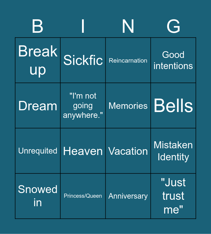 This bingo card has 16 words: Princess/Queen, Mistaken Identity, Reincarnation, Break up, Unrequited, Sickfic, Vacation, Anniversary, Dream, "I'm not going anywhere.", Snowed in, Good intentions, Heaven, Bells, Memories and "Just trust me".