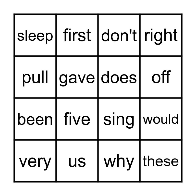 This bingo card has 16 words: us, would, don't, sleep, been, first, sing, why, pull, gave, very, right, five, off, does and these.