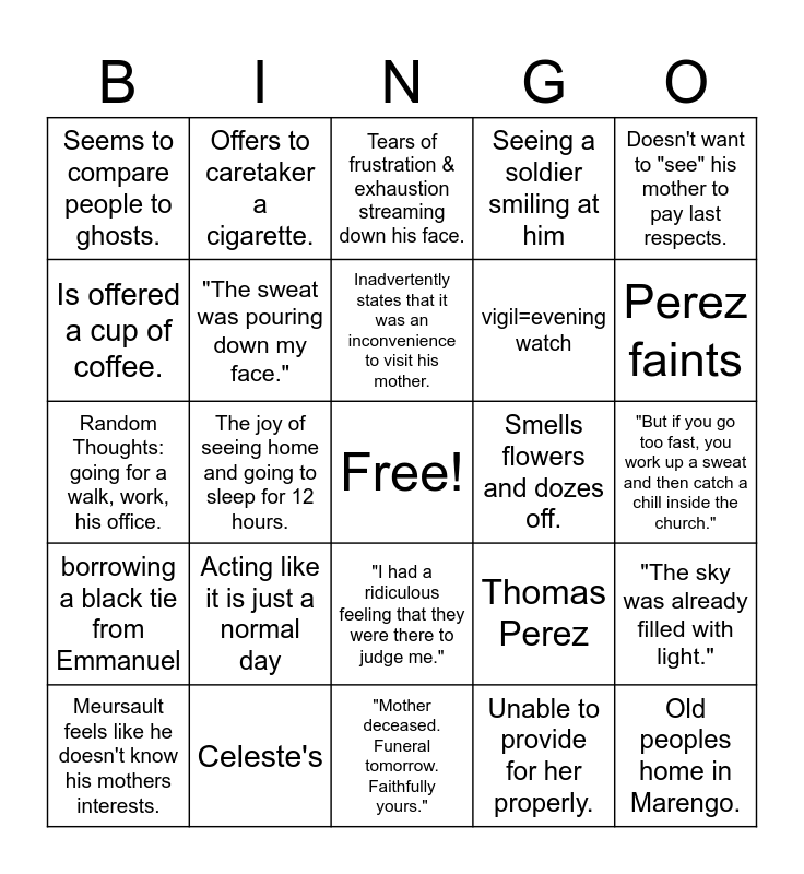 This bingo card has a free space and 25 words: Acting like it is just a normal day, "Mother deceased. Funeral tomorrow. Faithfully yours.", Inadvertently states that it was an inconvenience to visit his mother., Meursault feels like he doesn't know his mothers interests., Doesn't want to "see" his mother to pay last respects., Seems to compare people to ghosts., Is offered a cup of coffee., Offers to caretaker a cigarette., Smells flowers and dozes off., "I had a ridiculous feeling that they were there to judge me.", vigil=evening watch, Random Thoughts: going for a walk, work, his office., Thomas Perez, "The sky was already filled with light.", "The sweat was pouring down my face.", "If you go slowly , you risk getting sunstroke.", "But if you go too fast, you work up a sweat and then catch a chill inside the church.", Tears of frustration & exhaustion streaming down his face., Perez faints, The joy of seeing home and going to sleep for 12 hours., Old peoples home in Marengo., Celeste's, borrowing a black tie from Emmanuel, Seeing a soldier smiling at him and Unable to provide for her properly..