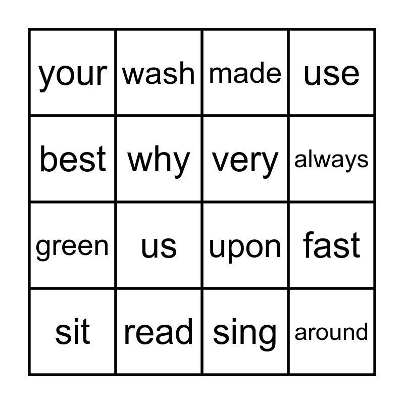 This bingo card has 16 words: read, fast, made, your, green, wash, upon, sing, best, why, sit, use, us, always, very and around.