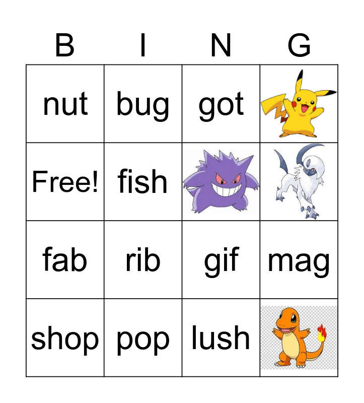 This bingo card has 4 images and 12 words: pop, mag, got, nut, fab, bug, gif, lush, Free!, fish, shop and rib.