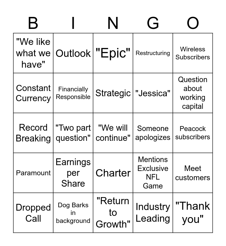 This bingo card has a free space and 29 words: Dropped Call, Awkward Silence, "Two part question", M&A Question, "We like what we have", "Epic", Financially Responsible, Earnings per Share, Someone apologizes, Dog Barks in background, Peacock subscribers, "Thank you", "Return to Growth", Industry Leading, Question about working capital, 2024, Charter, Paramount, Wireless Subscribers, Record Breaking, Mentions Exclusive NFL Game, DOCSIS 4.0, "Jessica", Constant Currency, Restructuring, Outlook, Meet customers, Strategic and Best in class.