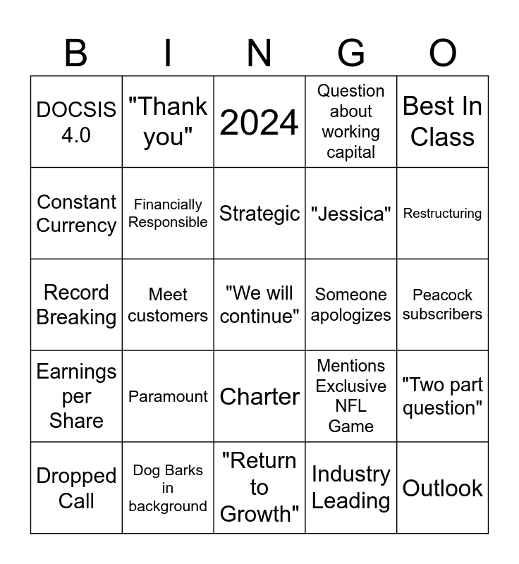 This bingo card has a free space and 29 words: Dropped Call, Awkward Silence, Meet customers, M&A Question, DOCSIS 4.0, 2024, Financially Responsible, Paramount, Someone apologizes, Dog Barks in background, Peacock subscribers, Outlook, "Return to Growth", Industry Leading, Restructuring, "Epic", Charter, Earnings per Share, Best In Class, Record Breaking, Mentions Exclusive NFL Game, "We like what we have", "Jessica", Constant Currency, Question about working capital, "Thank you", "Two part question", Strategic and Wireless Subscribers.