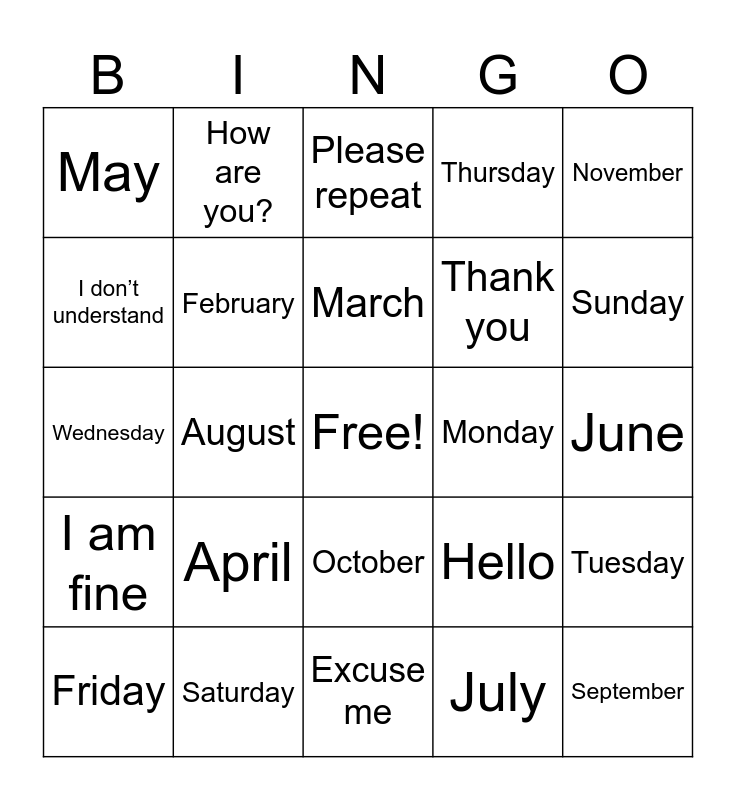 This bingo card has a free space and 27 words: Hello, Goodbye, Thank you, Excuse me, I don’t understand, Please repeat, How are you?, I am fine, Monday, Tuesday, Wednesday, Thursday, Friday, Saturday, Sunday, January, February, March, April, May, June, July, August, September, October, November and December.