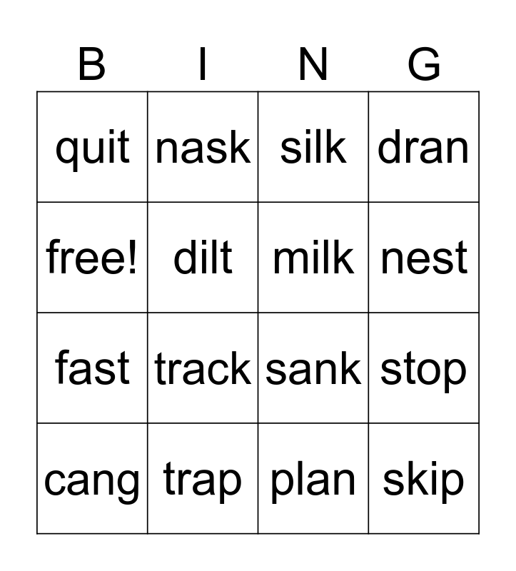 This bingo card has 16 words: trap, stop, silk, quit, fast, nask, sank, plan, free!, dilt, cang, dran, track, nest, milk and skip.