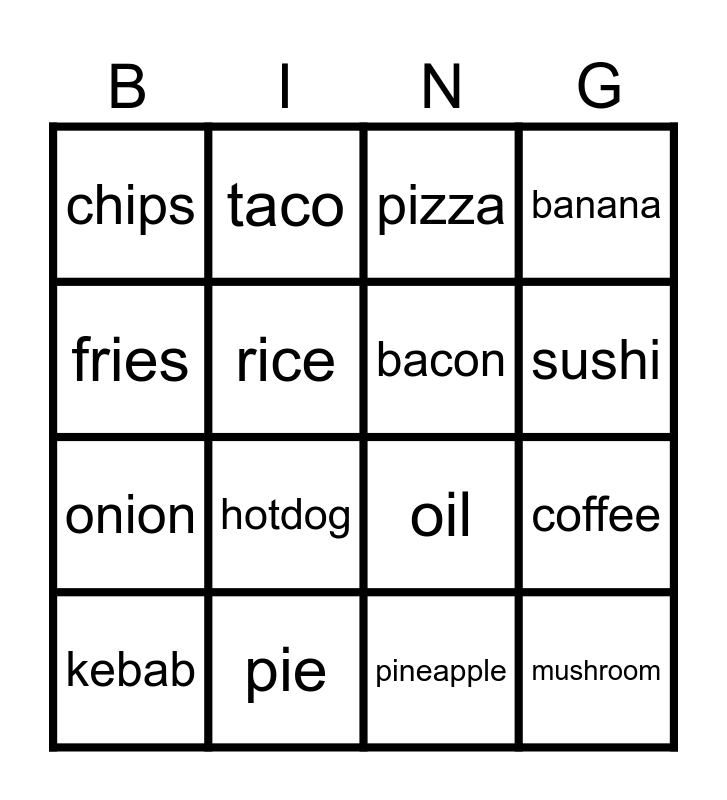 This bingo card has 16 words: pie, coffee, pizza, chips, onion, taco, oil, pineapple, fries, rice, kebab, banana, hotdog, sushi, bacon and mushroom.
