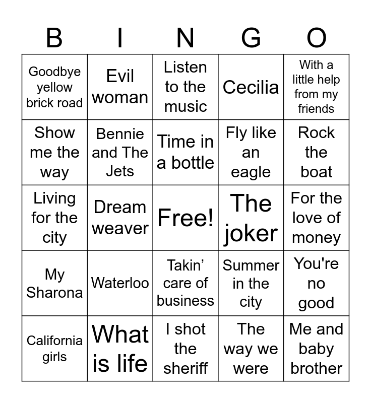This bingo card has a free space and 34 words: Come and get your love, The way we were, Good vibrations, The loco-motion, My Sharona, Bennie and The Jets, With a little help from my friends, California girls, Evil woman, I'm a believer, Time in a bottle, Listen to the music, Get back, Top of the world, The joker, Rock the boat, What is life, Living for the city, Waterloo, Summer in the city, Takin’ care of business, Radar love, Goodbye yellow brick road, For the love of money, I shot the sheriff, Me and baby brother, Cecilia, I got you babe, Fly like an eagle, Show me the way, These eyes, Dream weaver, You're no good and Monday, Monday.