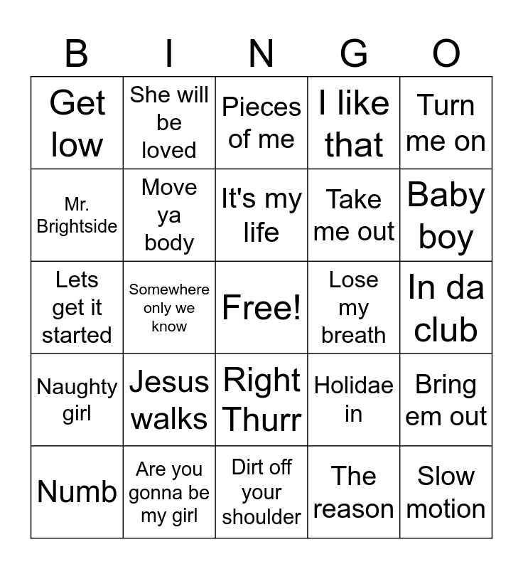 This bingo card has a free space and 34 words: Yeah!, The reason, Hey ya!, Here without you, Naughty girl, Move ya body, Turn me on, Numb, She will be loved, Heaven, It's my life, Pieces of me, Milkshake, Toxic, Lose my breath, Baby boy, Are you gonna be my girl, Lets get it started, Jesus walks, Holidae in, Right Thurr, The way you move, Get low, In da club, Dirt off your shoulder, Slow motion, I like that, Drop it like it's hot, Take me out, Mr. Brightside, Dragostea din tei, Somewhere only we know, Bring em out and Bring me to life.
