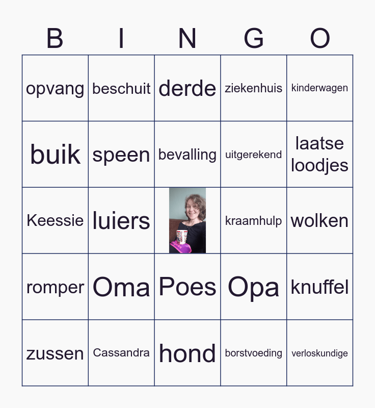This bingo card has a free space and 33 words: Roze, Bliksem poes, luiers, moe, romper, speen, kinderwagen, zussen, beschuit, eigenwijs, bevalling, derde, fietsstoeltje, kinderkamer, kraamhulp, laatse loodjes, Cassandra, Keessie, Oma, Opa, Poes, cadeautje, opvang, wolken, hond, verloskundige, ziekenhuis, uitgerekend, buik, knuffel, slabber, borstvoeding and melk.