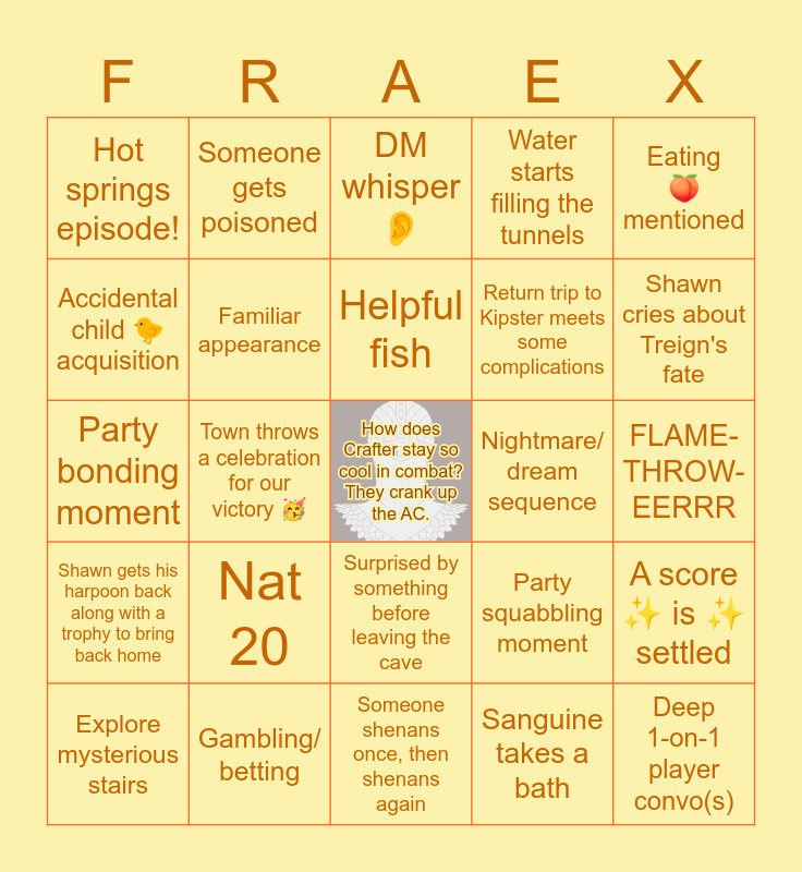 This bingo card has a free space and 24 words: Nat 20, Gambling/ betting, Helpful fish, Explore mysterious stairs, Eating π mentioned, Hot springs episode!, Accidental child π€ acquisition, Someone gets poisoned, Nightmare/ dream sequence, Surprised by something before leaving the cave, Return trip to Kipster meets some complications, Party bonding moment, Party squabbling moment, A score β¨ is β¨ settled, Familiar appearance, Sanguine takes a bath, FLAME-THROW-EERRR, DM whisper π, Shawn cries about Treign's fate, Town throws a celebration for our victory π₯³, Deep 1-on-1 player convo(s), Shawn gets his harpoon back along with a trophy to bring back home, Water starts filling the tunnels and Someone shenans once, then shenans again.