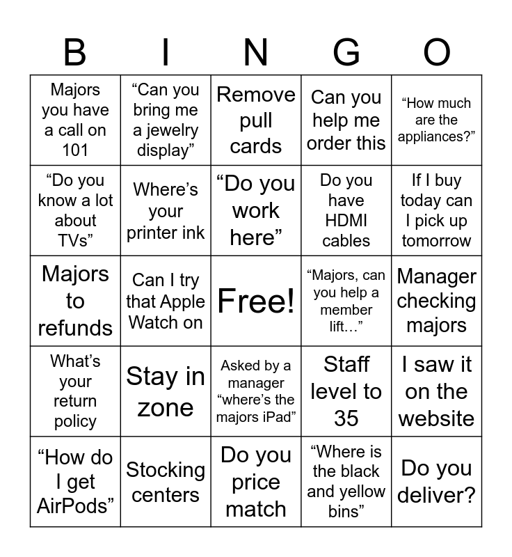 This bingo card has a free space and 24 words: Stay in zone, Stocking centers, “Do you work here”, “How do I get AirPods”, “How much are the appliances?”, Majors you have a call on 101, “Do you know a lot about TVs”, “Can you bring me a jewelry display”, “Majors, can you help a member lift…”, Asked by a manager “where’s the majors iPad”, Do you have HDMI cables, Majors to refunds, Staff level to 35, I saw it on the website, Where’s your printer ink, “Where is the black and yellow bins”, Manager checking majors, Remove pull cards, If I buy today can I pick up tomorrow, Can I try that Apple Watch on, Do you deliver?, What’s your return policy, Can you help me order this and Do you price match.