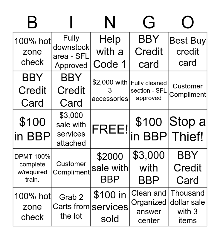 This bingo card has a free space and 24 words: Customer Compliment, Grab 2 Carts from the lot, $2,000 with 3 accessories, 100% hot zone check, Best Buy credit card, 100% hot zone check, BBY Credit Card, Fully downstock area - SFL Approved, $100 in BBP, $2000 sale with BBP, Fully cleaned section - SFL approved, $100 in BBP, $3,000 with BBP, BBY Credit Card, BBY Credit Card, Clean and Organized answer center, Stop a Thief!, Help with a Code 1, Customer Compliment, $3,000 sale with services attached, Thousand dollar sale with 3 items, DPMT 100% complete w/required train., BBY Credit card and $100 in services sold.