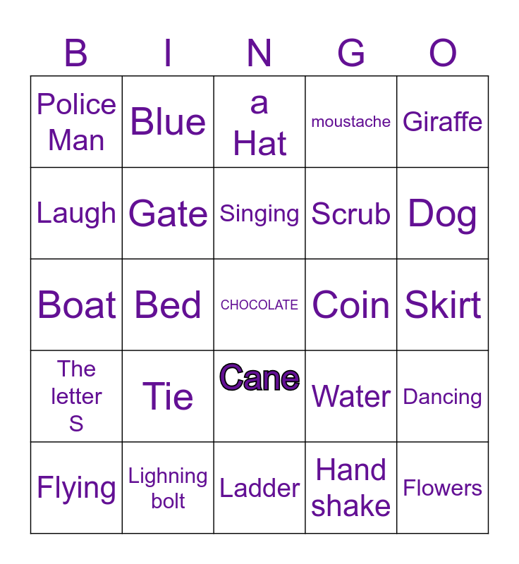 This bingo card has a free space and 29 words: Flying, Bench, Bed, Dancing, Police Man, a Hat, Gate, Tie, Coin, Lighning bolt, Skirt, Flowers, Ladder, Hand shake, Dog, Bag, Cane, The letter S, Giraffe, Boat, Water, Glasses, Scrub, Laugh, moustache, Blue, Dancing, Singing and Purple.