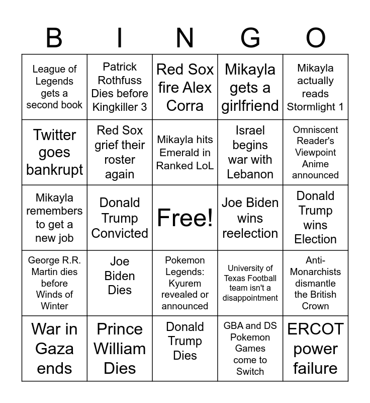 This bingo card has a free space and 24 words: Joe Biden Dies, Prince William Dies, Mikayla hits Emerald in Ranked LoL, War in Gaza ends, Mikayla actually reads Stormlight 1, League of Legends gets a second book, Twitter goes bankrupt, Patrick Rothfuss Dies before Kingkiller 3, Joe Biden wins reelection, Pokemon Legends: Kyurem revealed or announced, Israel begins war with Lebanon, Mikayla remembers to get a new job, University of Texas Football team isn't a disappointment, Anti-Monarchists dismantle the British Crown, Red Sox grief their roster again, GBA and DS Pokemon Games come to Switch, Donald Trump wins Election, Red Sox fire Alex Corra, Omniscent Reader's Viewpoint Anime announced, Donald Trump Convicted, ERCOT power failure, George R.R. Martin dies before Winds of Winter, Mikayla gets a girlfriend and Donald Trump Dies.