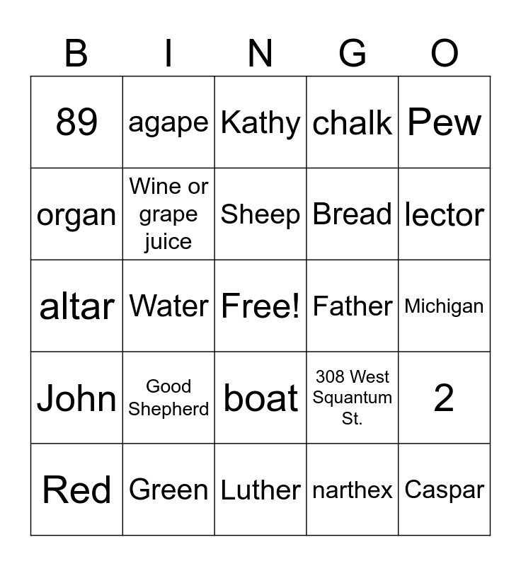This bingo card has a free space and 24 words: Good Shepherd, Green, Sheep, Red, Pew, 89, organ, agape, Father, boat, Bread, altar, 308 West Squantum St., 2, Wine or grape juice, narthex, Michigan, Kathy, lector, Water, Caspar, John, chalk and Luther.
