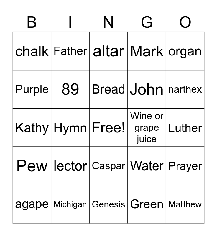 This bingo card has a free space and 34 words: Good Shepherd, Green, Sheep, Red, Pew, 89, organ, agape, Father, boat, Bread, altar, 308 West Squantum St., 2, Wine or grape juice, narthex, Michigan, Kathy, lector, Water, Caspar, John, chalk, Luther, Genesis, Matthew, Mark, Luke, John, Purple, Blue, Hymn, Prayer and Confession.