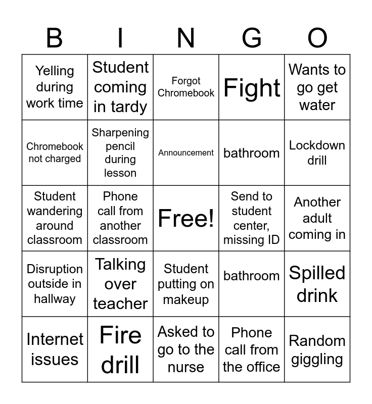 This bingo card has a free space and 27 words: bathroom, Asked to go to the nurse, bathroom, Asked to go to the nurse, Chromebook not charged, Forgot Chromebook, Student coming in tardy, Disruption outside in hallway, Send to student center, missing ID, Spilled drink, Student wandering around classroom, Fight, Internet issues, Fire drill, Lockdown drill, Someone at the door, Sharpening pencil during lesson, Announcement, Talking over teacher, Yelling during work time, Another adult coming in, Phone call from the office, Phone call from another classroom, Random giggling, Student putting on makeup, Wants to go get water and Have to wait for students to stop talking.