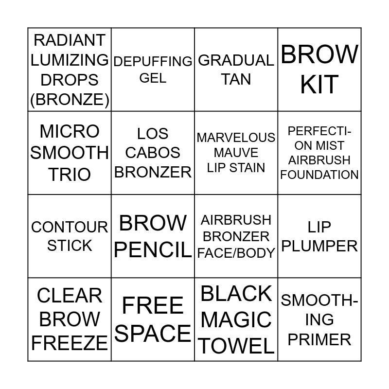 This bingo card has a free space and 15 words: CLEAR BROW FREEZE, SMOOTH- ING PRIMER, GRADUAL TAN, RADIANT LUMIZING DROPS (BRONZE), PERFECTI-ON MIST AIRBRUSH FOUNDATION, MICRO SMOOTH TRIO, BROW PENCIL, BLACK MAGIC TOWEL, LOS CABOS BRONZER, CONTOUR STICK, LIP PLUMPER, BROW KIT, MARVELOUS MAUVE LIP STAIN, DEPUFFING GEL and FREE SPACE.