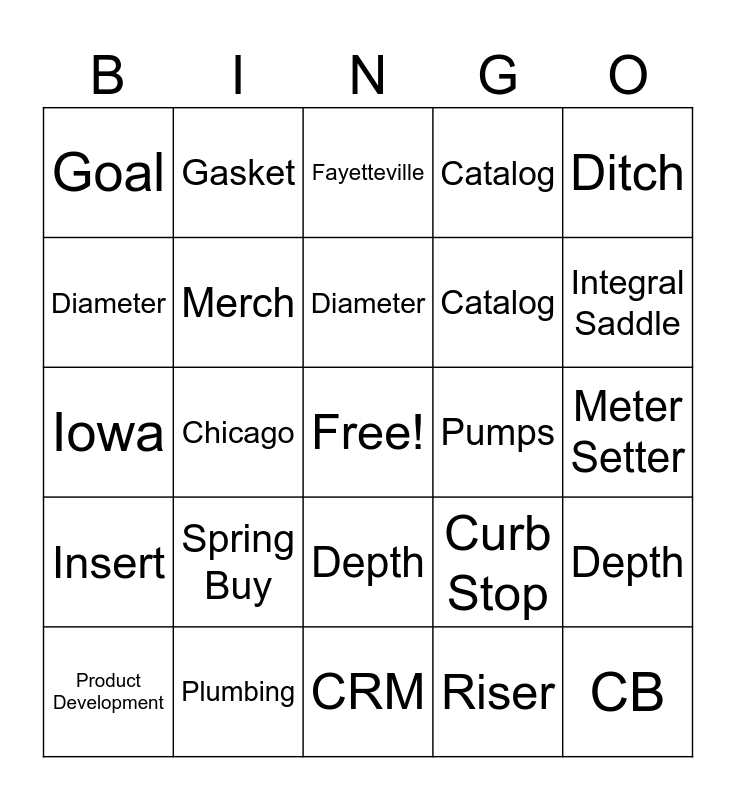 This bingo card has a free space and 29 words: Product Development, Co-Worker, Chicago, Coupling, Goal, Fayetteville, Merch, Spring Buy, Pumps, Plumbing, Meter Setter, CB, CRM, Riser, Integral Saddle, Ductile, Depth, Insert, Ditch, Iowa, Curb Stop, PVC, Catalog, Diameter, Catalog, Gasket, Depth, Diameter and Rigid.