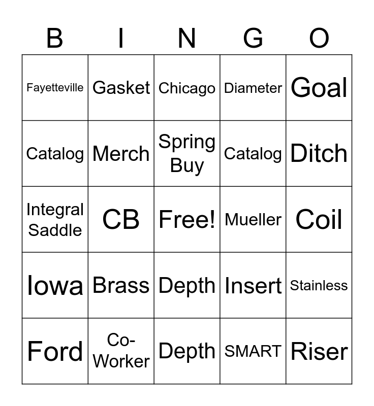 This bingo card has a free space and 29 words: Product Development, Co-Worker, Chicago, Coupling, Goal, Fayetteville, Merch, Spring Buy, Mueller, Stainless, Ford, CB, SMART, Riser, Integral Saddle, Ductile, Depth, Insert, Ditch, Iowa, Brass, Plastic, Catalog, Coil, Catalog, Gasket, Depth, Diameter and Rigid.