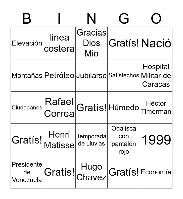 This bingo card has 25 words: Henri Matisse, Hugo Chavez, Jubilarse, Presidente de Venezuela, Nació, Elevación, Montañas, línea costera, Húmedo, Temporada de Lluvias, Satisfechos, Ciudadanos, Odalisca con pantalón rojo, 1999, Petróleo, Economía, Héctor Timerman, Gracias Dios Mio, Hospital Militar de Caracas, Rafael Correa, Gratís!, Gratís!, Gratís!, Gratís! and Gratís!.