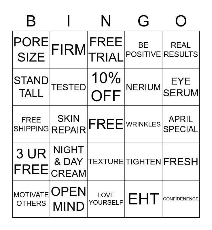 This bingo card has a free space and 24 words: NIGHT & DAY CREAM, OPEN MIND, 10% OFF, MOTIVATE OTHERS, REAL RESULTS, PORE SIZE, STAND TALL, FIRM, WRINKLES, TEXTURE, NERIUM, FREE SHIPPING, TIGHTEN, FRESH, TESTED, EHT, APRIL SPECIAL, FREE TRIAL, EYE SERUM, SKIN REPAIR, CONFIDENENCE, 3 UR FREE, BE POSITIVE and LOVE YOURSELF.
