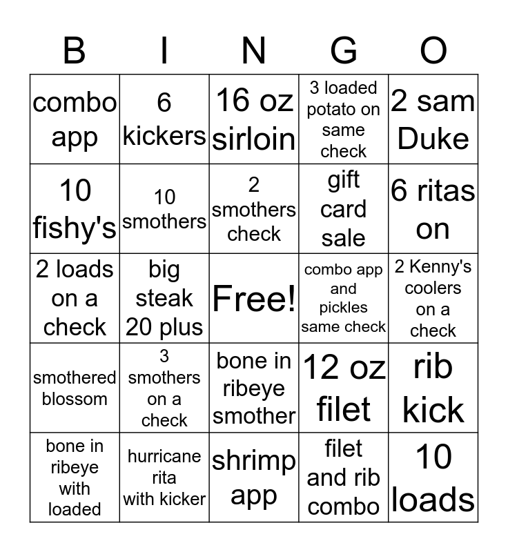 This bingo card has a free space and 24 words: 3 smothers on a check, hurricane rita with kicker, 2 smothers check, bone in ribeye with loaded, 2 sam Duke, combo app, 10 fishy's, 6 kickers, combo app and pickles same check, bone in ribeye smother, gift card sale, 2 loads on a check, 12 oz filet, rib kick, 10 smothers, filet and rib combo, 2 Kenny's coolers on a check, 16 oz sirloin, 6 ritas on, big steak 20 plus, 10 loads, smothered blossom, 3 loaded potato on same check and shrimp app.