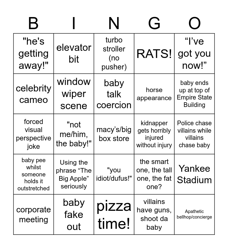 This bingo card has 25 words: Using the phrase “The Big Apple” seriously, pizza time!, baby talk coercion, corporate meeting, “I’ve got you now!”, "he's getting away!", celebrity cameo, elevator bit, kidnapper gets horribly injured without injury, "you idiot/dufus!", horse appearance, forced visual perspective joke, the smart one, the tall one, the fat one?, Yankee Stadium, window wiper scene, Apathetic bellhop/concierge, Police chase villains while villains chase baby, turbo stroller (no pusher), baby ends up at top of Empire State Building, "not me/him, the baby!", macy’s/big box store, baby fake out, baby pee whilst someone holds it outstretched, RATS! and villains have guns, shoot da baby.