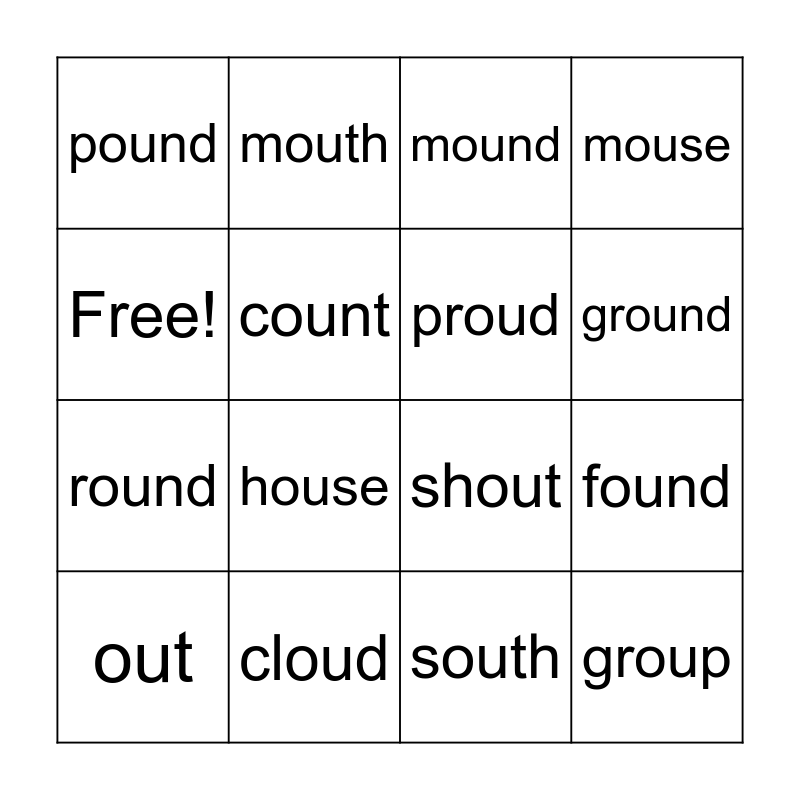 This bingo card has 16 words: cloud, found, mound, pound, round, mouth, shout, south, Free!, count, out, mouse, house, ground, proud and group.