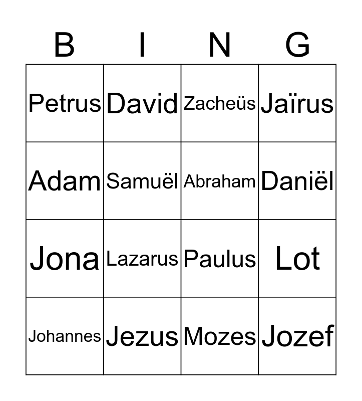 This bingo card has 21 words: Jezus, Noach, David, Eva, Mozes, Abraham, Petrus, Zacheüs, Paulus, Daniël, Jona, Jaïrus, Jozef, Maria, Samuël, Ruth, Johannes, Lazarus, Adam, Lot and Goliath.