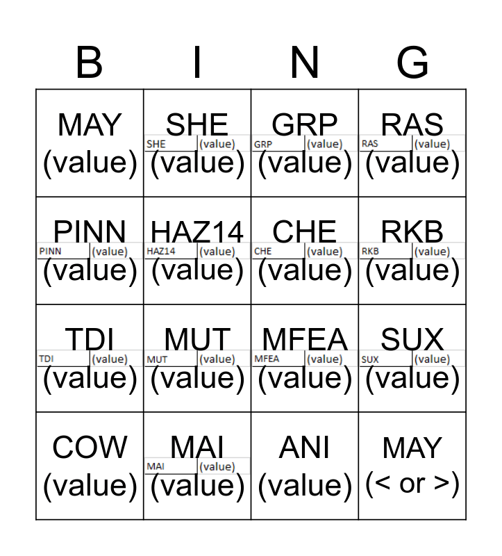 This bingo card has 13 images and 17 words: ANI (value), COW (value), GRP (value), MAY (value), MUT (value), RAS (value), SUX (value), CHE (value), RKB (value), HAZ14 (value), MAI (value), MFEA (value), PINN (value), SHE (value), TDI (value), CUC (value) and MAY (< or >).