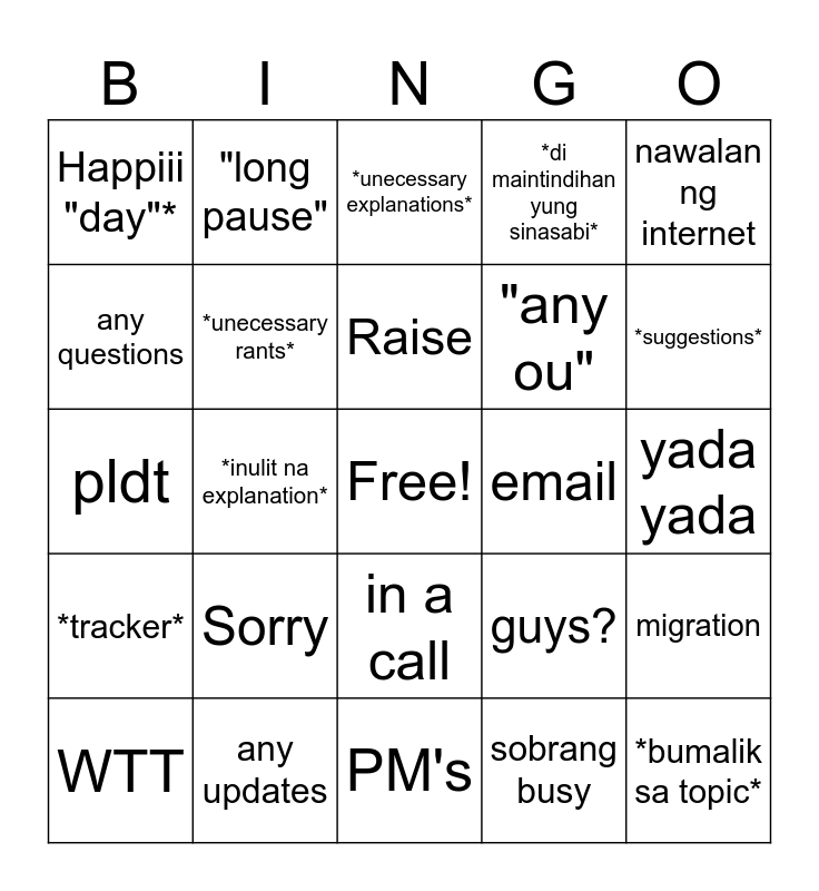 This bingo card has a free space and 24 words: Sorry, any updates, Raise, WTT, nawalan ng internet, Happiii "day"*, any questions, "long pause", email, in a call, "any ou", pldt, guys?, migration, *unecessary rants*, sobrang busy, yada yada, *unecessary explanations*, *suggestions*, *inulit na explanation*, *bumalik sa topic*, *tracker*, *di maintindihan yung sinasabi* and PM's.