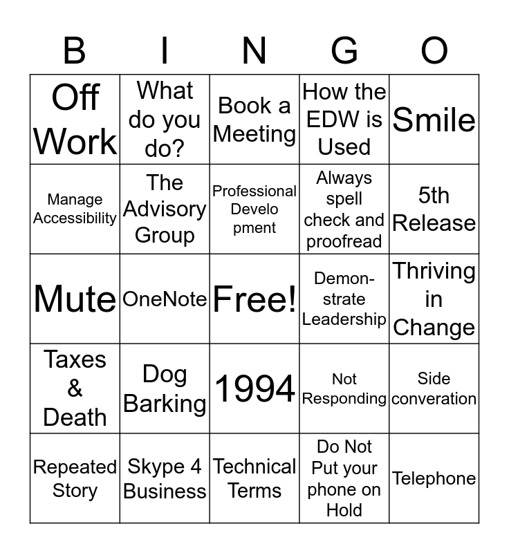 This bingo card has a free space and 24 words: Dog Barking, Skype 4 Business, Professional Develo pment, Repeated Story, Smile, Off Work, Manage Accessibility, What do you do?, Demon-strate Leadership, 1994, Always spell check and proofread, Mute, Not Responding, Side converation, The Advisory Group, Do Not Put your phone on Hold, Thriving in Change, Book a Meeting, 5th Release, OneNote, Telephone, Taxes & Death, How the EDW is Used and Technical Terms.