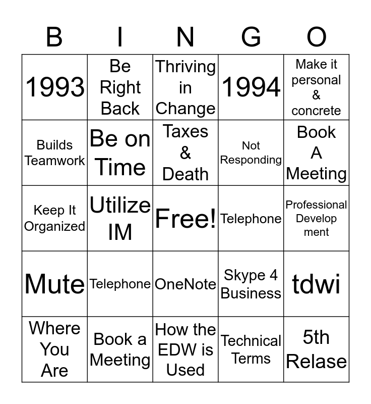 This bingo card has a free space and 24 words: Telephone, Book a Meeting, Taxes & Death, Where You Are, Make it personal & concrete, 1993, Builds Teamwork, Be Right Back, Telephone, OneNote, Not Responding, Keep It Organized, Skype 4 Business, tdwi, Be on Time, Technical Terms, Professional Develop ment, Thriving in Change, Book A Meeting, Utilize IM, 5th Relase, Mute, 1994 and How the EDW is Used.