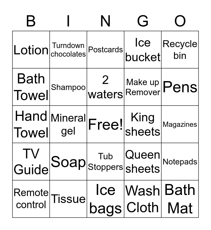 This bingo card has a free space and 24 words: Soap, Tissue, 2 waters, Remote control, Recycle bin, Lotion, Bath Towel, Turndown chocolates, King sheets, Tub Stoppers, Make up Remover, Hand Towel, Queen sheets, Notepads, Shampoo, Wash Cloth, Magazines, Postcards, Pens, Mineral gel, Bath Mat, TV Guide, Ice bucket and Ice bags.