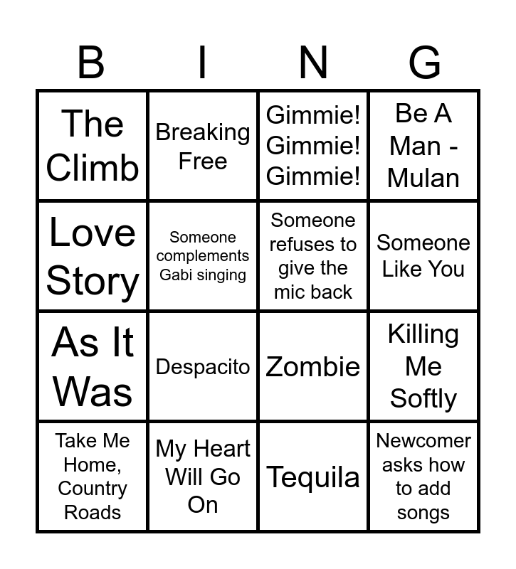 This bingo card has 46 words: Sweet Caroline, Take Me Home, Country Roads, Shallow, Flowers, Gotta go my own way, Olivia, Breaking Free, Mamma mia, Someone complements Gabi singing, C sings Treat You Better, Someone refuses to give the mic back, Be A Man - Mulan, Barbie Girl, Don't Stop Beliving, Bohemian Rapsody, Sweet Child O' Mine, Someone Like You, My Heart Will Go On, Creep, Love Story, Killing Me Softly, Wonderwall, The Climb, As It Was, I Kissed A Girl, Despacito, Don't Look Back In Anger, Y.M.C.A, Stacy's Mum, Newcomer asks how to add songs, The weird used to be hot guy serves at the bar, Random group of ppl comes in sings one song and leaves, There is a couple where only one of the ppl sings, One of the mics falls appart, Someone asks about the bingo, Fireball, Tequila, What makes you beautiful, Someone drops a drink, There's a bachelorette party, Toxic, Gimmie! Gimmie! Gimmie!, Zombie, Bring me to life, You belong with me and All too well - 10min version.
