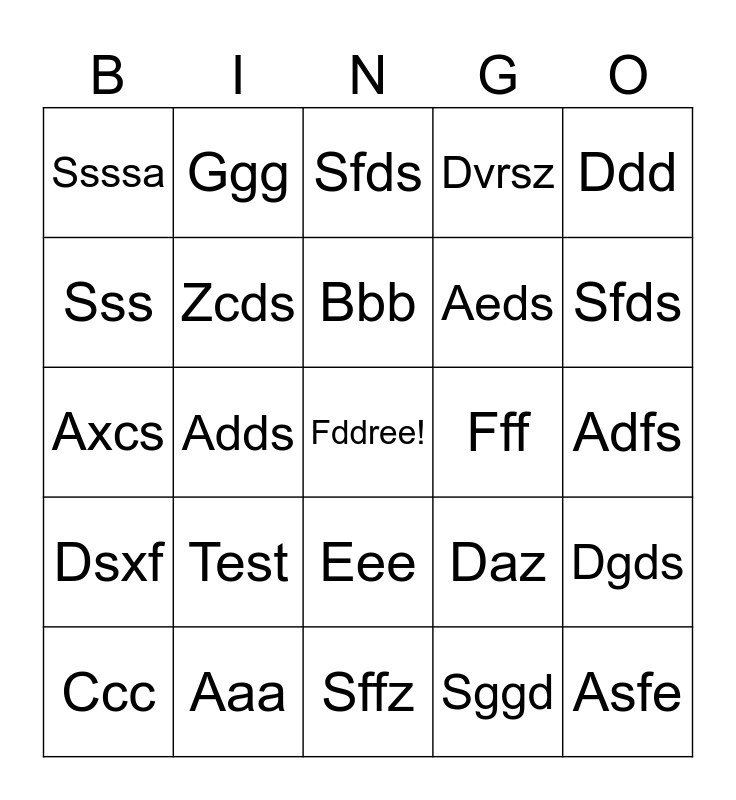 This bingo card has a free space and 24 words: Test, Aaa, Bbb, Ccc, Ddd, Ssssa, Sss, Ggg, Fff, Eee, Aeds, Axcs, Daz, Dgds, Zcds, Sggd, Adfs, Sfds, Sfds, Adds, Asfe, Dsxf, Dvrsz and Sffz.