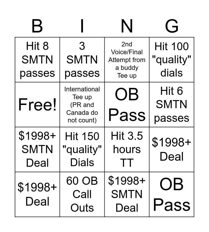 This bingo card has 16 words: 60 OB Call Outs, $1998+ Deal, 2nd Voice/Final Attempt from a buddy Tee up, Hit 8 SMTN passes, $1998+ SMTN Deal, 3 SMTN passes, Hit 3.5 hours TT, $1998+ SMTN Deal, Free!, International Tee up (PR and Canada do not count), $1998+ Deal, Hit 100 "quality" dials, Hit 150 "quality" Dials, Hit 6 SMTN passes, OB Pass and OB Pass.