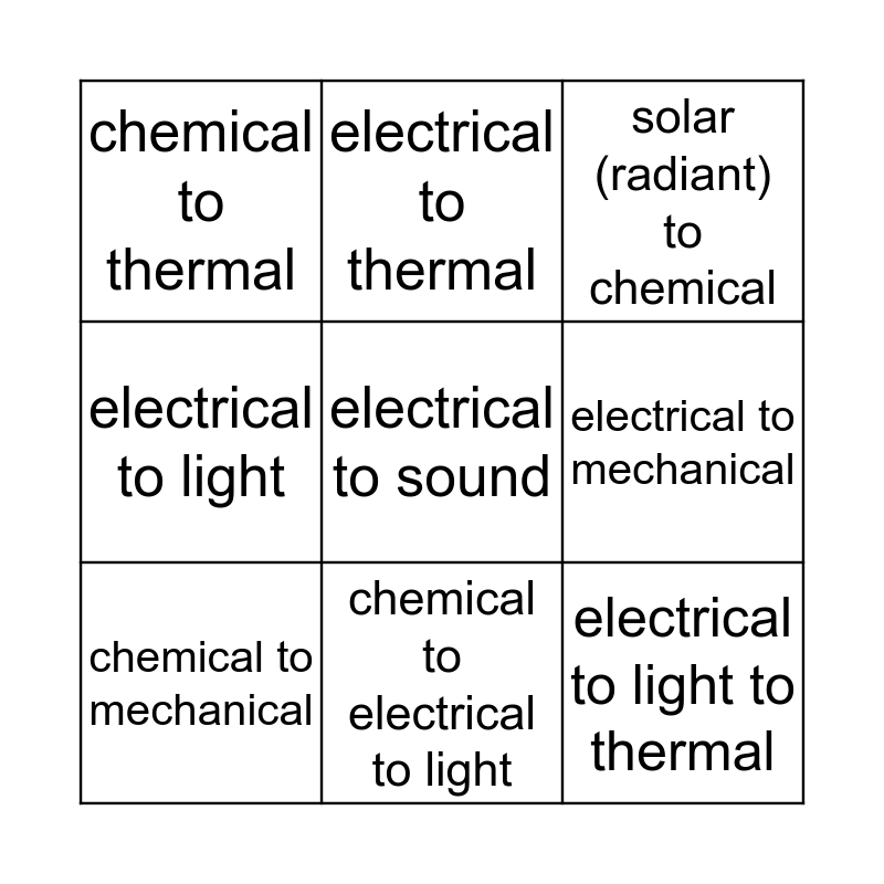 This bingo card has 9 words: chemical to mechanical, solar (radiant) to chemical, electrical to thermal, electrical to light, chemical to thermal, electrical to mechanical, electrical to sound, electrical to light to thermal and chemical to electrical to light.