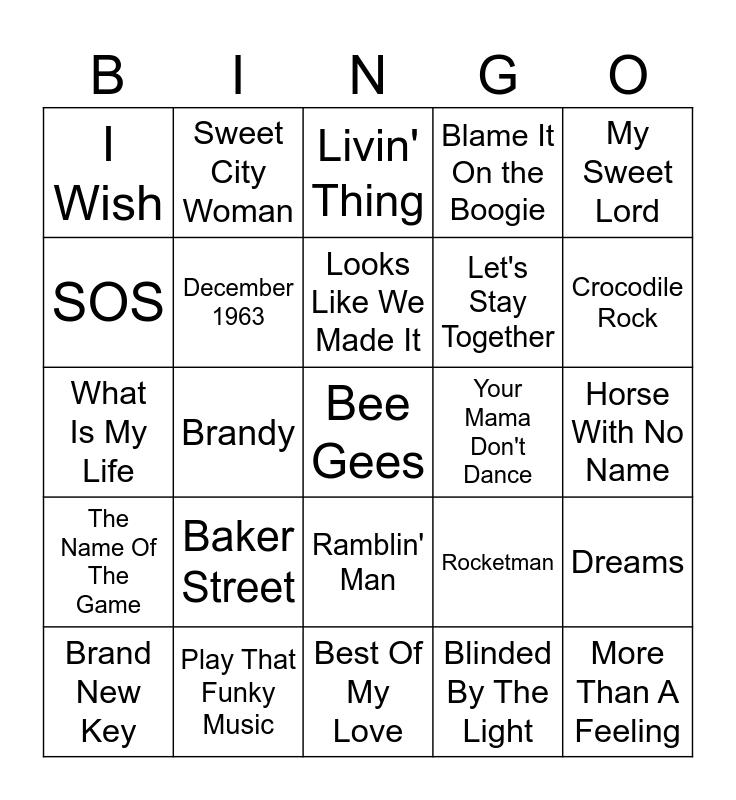 This bingo card has a free space and 24 words: Baker Street, Play That Funky Music, Looks Like We Made It, Brand New Key, My Sweet Lord, I Wish, SOS, Sweet City Woman, Your Mama Don't Dance, Ramblin' Man, Let's Stay Together, What Is My Life, Rocketman, Dreams, December 1963, Blinded By The Light, Horse With No Name, Livin' Thing, Crocodile Rock, Brandy, More Than A Feeling, The Name Of The Game, Blame It On the Boogie and Best Of My Love.