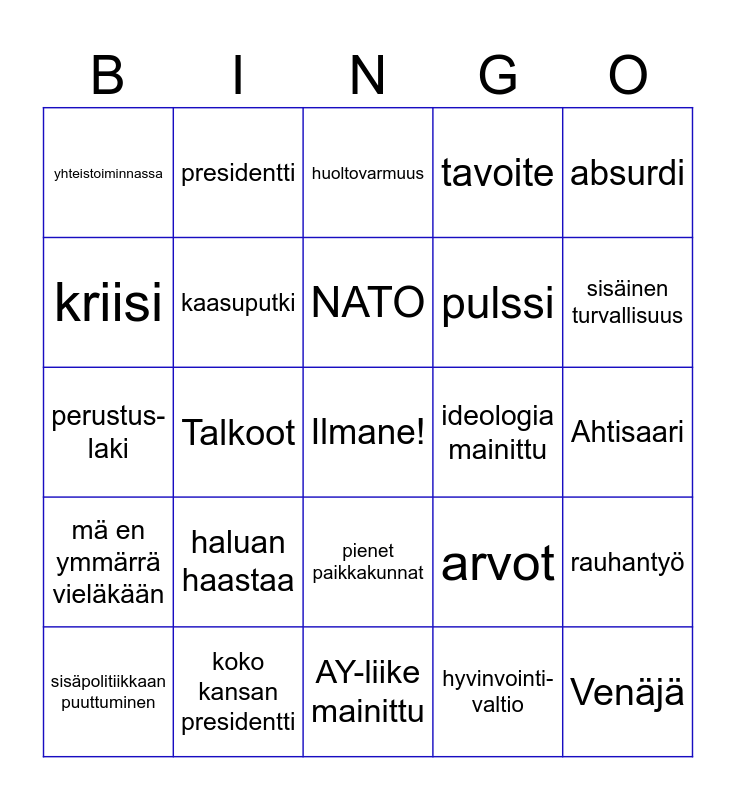 This bingo card has a free space and 29 words: sisäpolitiikkaan puuttuminen, keskellä, Talkoot, unilukkari, yhteistoiminnassa, huoltovarmuus, kaasuputki, haluan haastaa, ideologia mainittu, koko kansan presidentti, Ahtisaari, Venäjä, AY-liike mainittu, hyvinvointi-valtio, sisäinen turvallisuus, kollega, pienet paikkakunnat, mä en ymmärrä vieläkään, absurdi, perustus-laki, arvot, ylistää Tansaa, pulssi, kriisi, tavoite, presidentti, rauhantyö, NATO and puolustus.