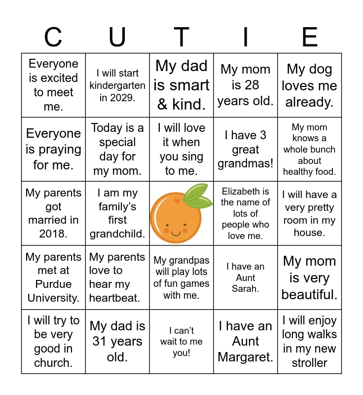 This bingo card has a free space and 24 words: My parents love to hear my heartbeat., My dad is 31 years old., I will love it when you sing to me., I will try to be very good in church., My dog loves me already., Everyone is excited to meet me., Everyone is praying for me., I will start kindergarten in 2029., Elizabeth is the name of lots of people who love me., My grandpas will play lots of fun games with me., I have 3 great grandmas!, My parents got married in 2018., I have an Aunt Sarah., My mom is very beautiful., Today is a special day for my mom., I have an Aunt Margaret., I will have a very pretty room in my house., My dad is smart & kind., My mom knows a whole bunch about healthy food., I am my family’s first grandchild., I will enjoy long walks in my new stroller, My parents met at Purdue University., My mom is 28 years old. and I can’t wait to me you!.