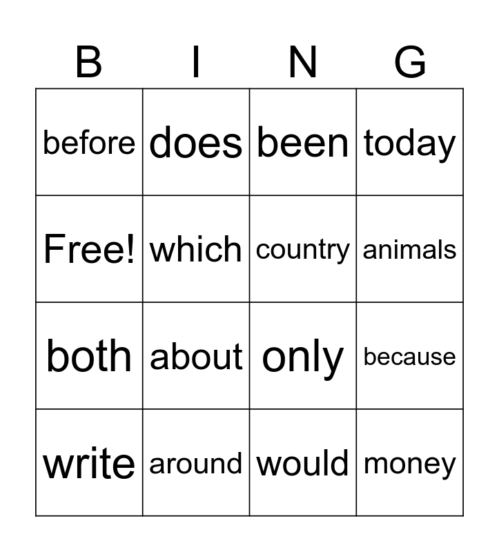This bingo card has 16 words: around, because, been, before, both, does, only, would, Free!, which, write, today, about, animals, country and money.